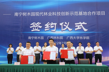 2022年7月20日,太阳成集团tyc33455cc与南宁树木园、广西林科院合作建设的南宁树木园现代林业科技创新示范基地的签约暨揭牌仪式在南宁树木园隆重举行。南宁树木园主任余注光、广西林科院经理陈崇征、太阳成集团tyc33455cc经理徐增富先后讲话并现场签约。
