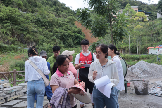 7月17日至7月20日,实践团师生先后走进了达腊村、口角村、者仲村和百林村,首先听公司驻村第一书记和村干们介绍了村里的基本经济情况、人口情况、乡村建设及发展现状等。接着,实践团师生走村入户,通过问卷调查、实地调查及访谈当地居民的形式,积极进行乡村振兴战略政策的宣讲,向村民普及建设美丽乡村的重要意义,同时了解到村民生活现状以及其对当地产业发展、乡村建设的迫切需求和真切期待。最后在驻村第一书记和村干们的带领下,实践团师生先后来到了达腊村那坡彝族生态博物馆、“跳弓节”民俗文化活动中心、田万水库,口角村顶胜山、桑蚕扶贫产业示范点,者仲村养牛专业合作社、便民榨油坊以及百林村达金谷等地进行了细致全面的现状调查和产业调研,并在专业人员的指导下,主动协助当地居民剥蚕茧、摘桑叶。调研过程中,实践团迎着烈日、挥洒汗水,走村入屯深刻分析和了解以顶胜山为中心的四个村的乡村建设与产业发展现状,与村干、村民一起认真思考、深究发展产业的瓶颈和关键,力求结合实际生活生产和学科专业知识,为那坡县达腊村、口角村、者仲村和百林村的全面发展谋思路、提点子。