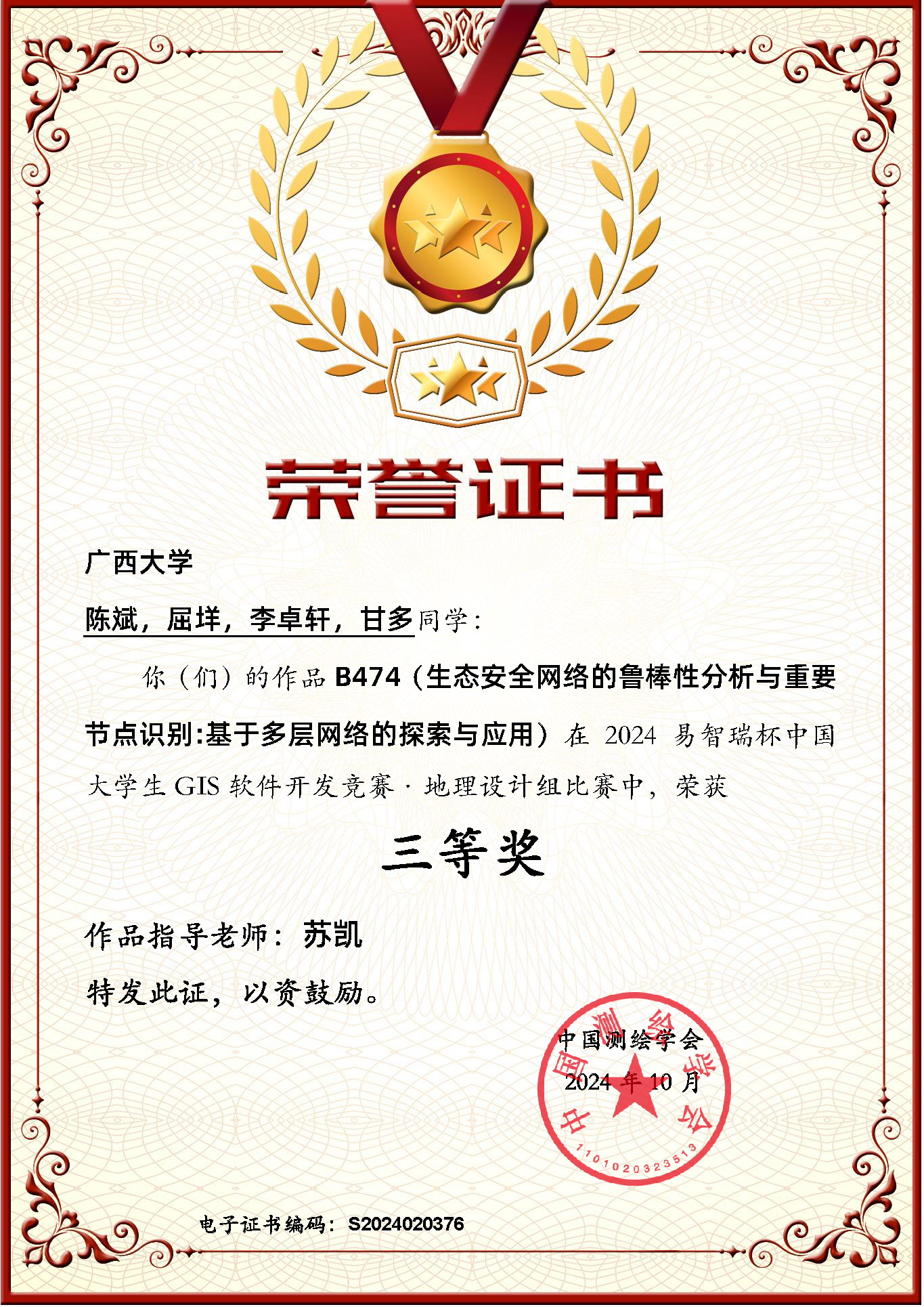 近日,2024年“易智瑞杯”中国老员工GIS软件开发竞赛地理设计组评选结果正式揭晓!由公司苏凯老师指导的作品《生态安全网络的鲁棒性分析与重要节点识别:基于多层网络的探索与应用》(参赛员工:陈斌、屈垟、甘多、李卓轩)和《基于深度学习与生态网络的南宁城区水源涵养能力提升与蓝绿基础设施优化》(参赛员工:陈兴华),获地理设计组三等奖。