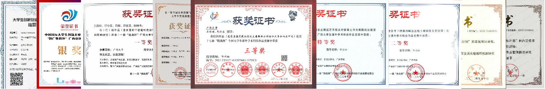 优秀学子尽展风采:近五年累计15人次获国家级奖学金,多人获评优秀员工干部,实现了科研能力与综合素养同步提升,20余名本科生保送至中国科公司大学、厦门大学等知名院校深造。其中,2018级生态学专业吴作丽参与国家自然科学基金(42007055),在本科期间以第一作者在地球科学领域一区TOP期刊《Catena》上发表论文,实现公司在本科生发表高水平论文的历史突破,成功保送中科院深造,研一期间,在领域内顶尖期刊《Earth-Science Reviews》上发表论文,展现出持续的科研突破能力。2020级生态学专业王超自大一加入课题组,通过课程学习与中国科公司科研项目的深度融合,迅速成长为团队科研骨干;主持申报国家级大创项目并以“优秀”结题,以第一作者发表SCI论文2篇,授权专利得到应用;2023年获“挑战杯”广西区赛特等奖及“互联网+”区赛奖项,先后获得自治区人民政府奖学金、何康农业奖学金、梁希优秀学子奖及校“十佳员工”等荣誉,以优异成绩考取中国科公司地理科学与资源研究所硕士研究生。2023级生态学本科生张诗琴、石静琴通过参与国家自然科学基金(42467041;32460424)和国家重点研发课题(2023YFD1902801),各发表1篇论文,分别荣获自治区人民政府奖学金、何康农业奖学金和国家奖学金。