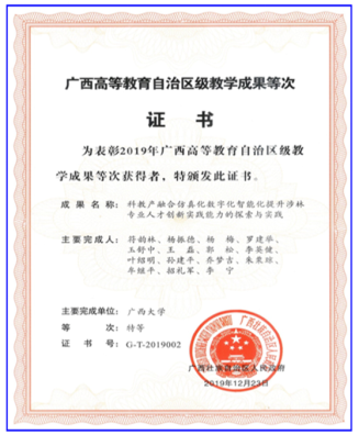 教学成果:林学获国家一流本科专业建设点、国家卓越农林人才培养计划专业、国家特色专业、广西高校优势特色专业、广西创新创业教育改革示范专业;生态学获广西优势特色专业。《木材学》课程获国家精品课程、国家精品资源共享课,《红木文化》获广西线上一流课程,《木材美学》、《林学专业导论》获广西精品视频公开课,《森林生态学》获广西精品课程,木材学与森林生态学为广西壮族自治区级教学团队。“科教产融合仿真化数字化智能化提升涉林专业人才创新实践能力的探索与实践”获广西教学成果特等奖。