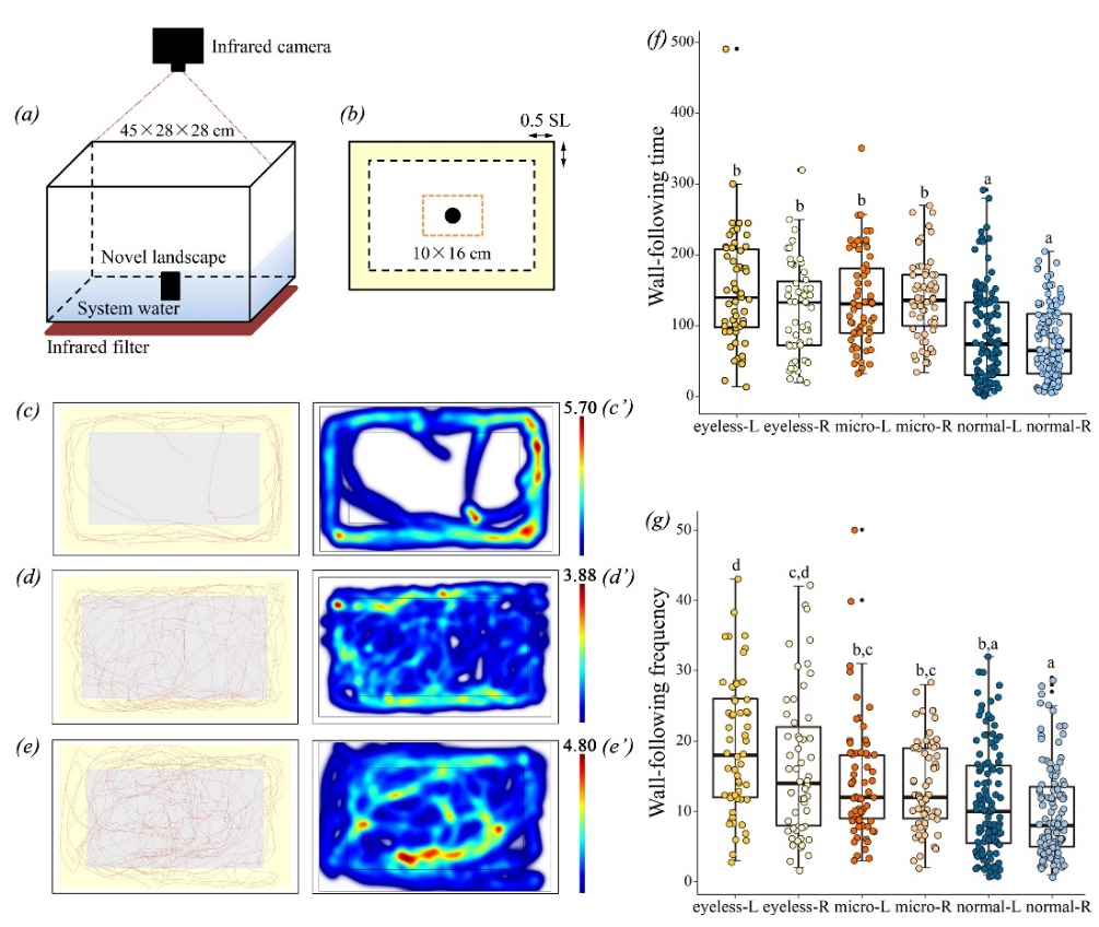 研究结果表明眼睛消失与穴居者侧线神经丘的代偿性扩张有关,即洞穴鱼头部一侧(右侧或左侧)的神经丘比另一侧多。这种不对称性在没有眼睛或非常小眼睛的物种中更加明显。当研究人员测试洞穴鱼自由游泳的能力时,无眼物种倾向于贴近在身体一侧的墙上,那里往往分布有更多的神经丘。行为学分析也证明了无眼物种具有独特的贴壁行为。所以,对于生活在永久黑暗中的生物来说,跟随墙壁是一种成功的生存策略。不对称的神经丘系统在远亲不化系统的洞穴鱼物种中独立进化,这些表型和行为模式与世界上其他的洞穴鱼类趋同。鉴于神经丘系统从进化和生态学角度的重要性,此研究不仅可以加深洞穴鱼生物进化和形成的认识,还将为金线鲃这一特有珍稀鱼类的保护提供科学依据。