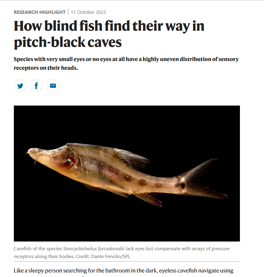 太阳成集团tyc33455cc马德华(Madhava)课题组,在生物学领域期刊《Proceedings of the Royal Society B: Biological Sciences》正式发表题为“Sensory evolution in a cavefish radiation: patterns of neuromast distribution and associated behaviour in Sinocyclocheilus (Cypriniformes: Cyprinidae)”的研究论文,这一成果也受到了Nature杂志Research Highlights的报道宣传。