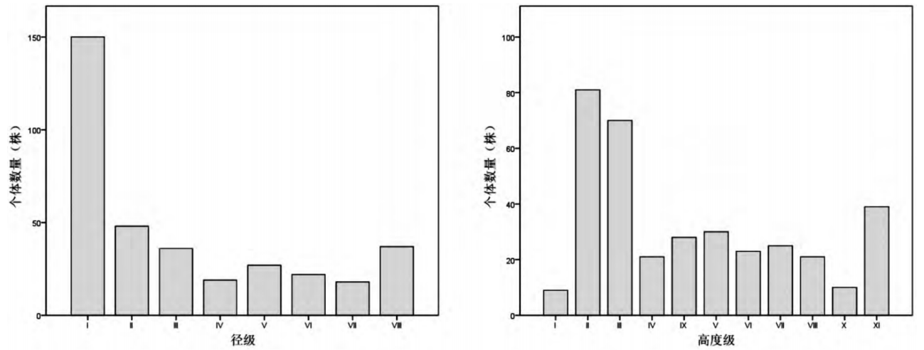 图1 望天树天然林高度级和径级分布