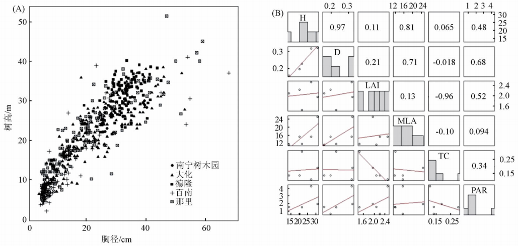 图2望天树胸径、树高关系分布(A) 及其与冠层参数之间的相关性(B)