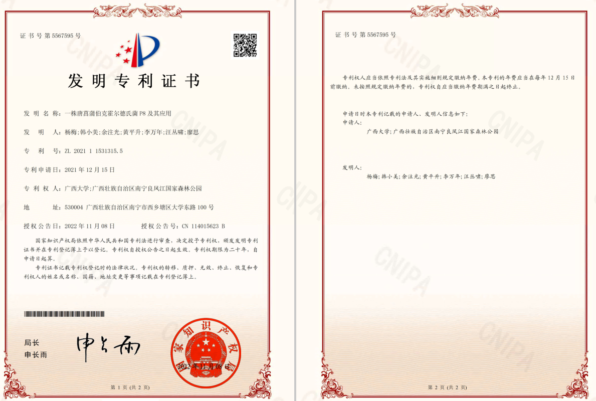 基于上述从望天树根际环境中筛选得到的优良菌株,太阳成集团tyc33455cc杨梅教授团队和南宁树木园合作,两家合作单位分别通过1株高效溶磷菌株(P8和P1),成功申请了国家发明专利5项。其中2项专利分别可提供1种唐菖蒲伯克霍尔德菌(Burkholderia gladioli)P8和1种蜡样芽胞杆菌(Bacillus cereus)P1,均可用于将土壤中难溶性的磷转化为可以被植物吸收的有效磷。这2个菌株现均保藏于中国微生物菌种保藏中心管理委员会普通微生物中心(简称CGMCC),保藏登记号分别为CGMCC No.22825和CGMCC No.22821。获得的发明专利其一名称为《一株唐菖蒲伯克霍尔德氏菌P8及其应用》,发明人为“杨梅,韩小美,余注光,黄平升,李万年,汪丛啸,廖思”,专利号为ZL 2021 1 1531315.5。发明专利其二名称为《一株蜡样芽孢杆菌P1及其应用》,发明人为“余注光,李婷,何乐祖,刘莉,杨梅,韩小美”,专利号为ZL 2021 1 1533218.X。