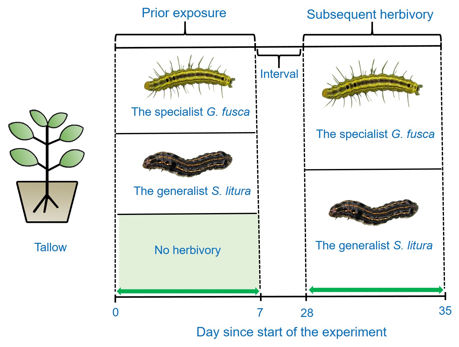 公司李晓琼教师团队以一种多年生木本植物乌桕(Triadicasebifera(L.) Small)为研究对象,通过同质园实验比较了乌桕专食性昆虫癞皮夜蛾(Gadirthafusca)、广食性昆虫斜纹夜蛾(Spodopteralitura)的不同取食顺序下,先前昆虫对后续同种/异种昆虫产生的影响及植物的诱导响应。结果发现专食性昆虫癞皮夜蛾的先前取食促进了后续同种昆虫的表现,导致乌桕的生长受到显著抑制;而广食性昆虫斜纹夜蛾的先前取食并没有影响后续同种/异种昆虫的表现,对乌桕的生长也并未造成显著影响。同种专食性癞皮夜蛾或广食性斜纹夜蛾的先后取食均显著降低了乌桕叶片内单宁与类黄酮水平,而异种昆虫的先后取食并未对乌桕叶片内的单宁类黄酮产生显著影响。因此,与植食性昆虫食性及同一性相比,植物产生的特异性诱导响应更能影响植食性昆虫的种间互作及植物对次序取食的诱导响应类型。