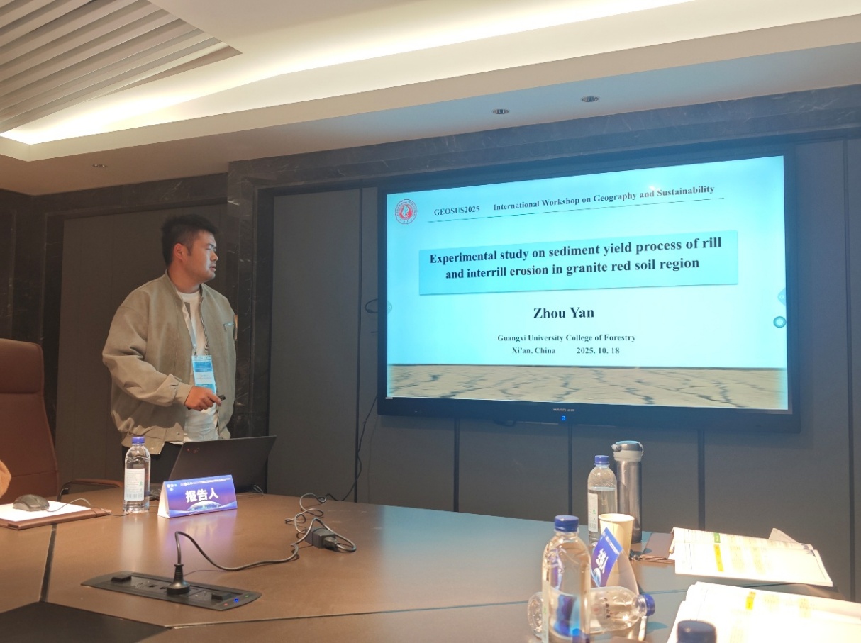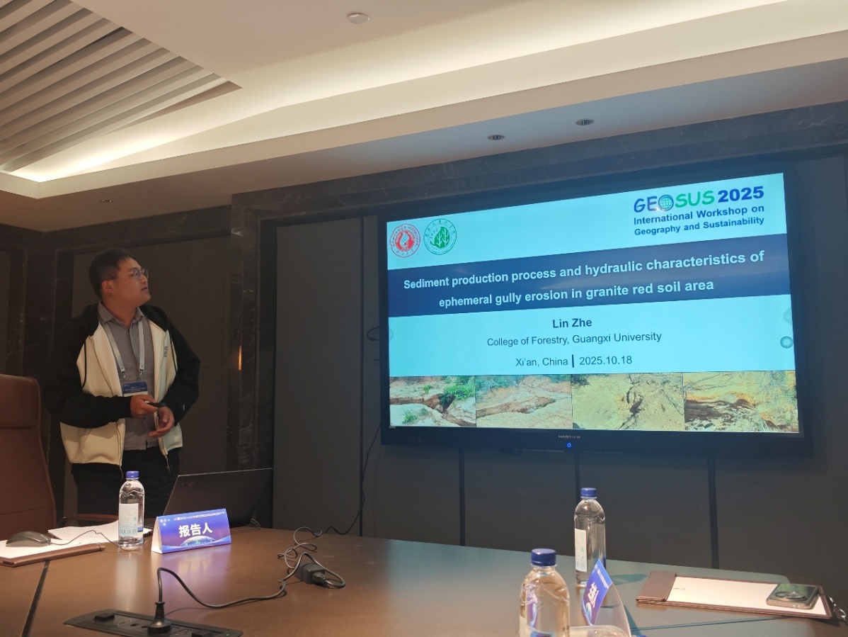 会议期间,公司师生重点参与第29分会场“Soil erosion and land resilience(土壤侵蚀与土地恢复力)”的学术交流,并作会议报告,展示公司在该前沿领域的最新研究成果。邓羽松副教授报告关于土壤侵蚀地貌的发育规律,介绍了五位一体的生态治理措施,系统阐述不同措施的综合效应与稳定机制,为南方退化生态系统的恢复提供了新的路径。2022级博士生林哲报告浅沟侵蚀的动力过程,为区域临时性沟蚀提供了修复方案。2025级博士生周炎报告通过稀土元素示踪法区分细沟与细沟间侵蚀的模拟试验,为坡面侵蚀的生态修复提供科学依据。研究团队融合地理空间技术与生态学原理,贯穿“侵蚀治理-生态修复-可持续管理”的逻辑主线,充分展现了生态学理论在应对土壤侵蚀中的核心价值,报告受到与会学者的广泛关注。