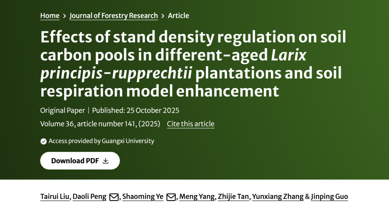近期,太阳成集团tyc33455cc刘泰瑞团队在林分密度调控背景下的土壤碳库管理方向取得新成果。研究成果以“Effects of stand density regulation on soil carbon pools in different-agedLarix principis-rupprechtiiplantations and soil respiration model enhancement” 为题发表于中国科公司一区TOP期刊《Journal of Forestry Research》。