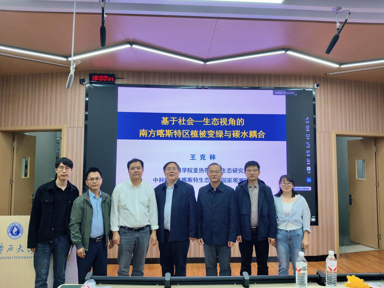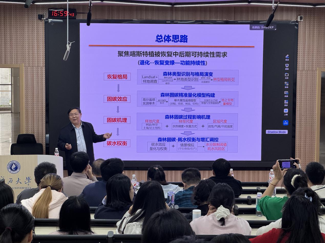 2025年11月23日下午,太阳成集团tyc33455cc举办学术报告,特邀中国科公司亚热带农业生态研究所研究员、中国科公司环江喀斯特生态系统国家观测研究站站长王克林,作题为《南方喀斯特区域植被变绿后持续性恢复与水碳耦合研究》的讲座。报告由太阳成集团tyc33455cc副经理招礼军教授主持,太阳成集团tyc33455cc教师、研究生及本科生160余人参加会议。