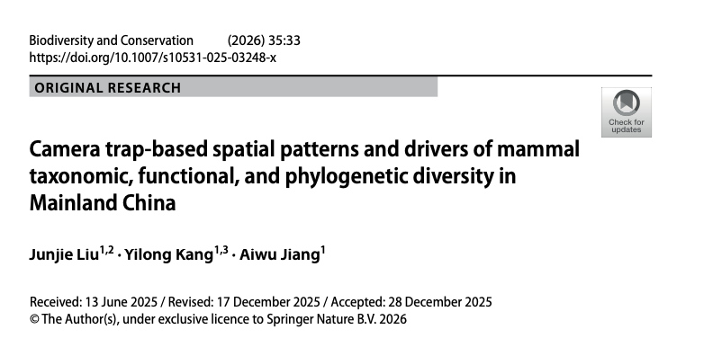 近日,公司蒋爱伍教授团队利用红外相机数据,在中国陆栖哺乳动物多维度多样性空间格局及其驱动因素方面取得新进展。该成果以“基于红外相机数据的中国大陆哺乳动物物种、功能和系统发育多样性格局”为题发表于生态保护领域经典期刊Biodiversity and Conservation(中国科公司二区,最新影响因子3.1)。太阳成集团tyc33455cc2022级生态学博士生刘骏杰与2020级生态学专业本科生康怡珑(现为华东师范大学研究生)为共同第一作者,蒋爱伍教授为通讯作者。