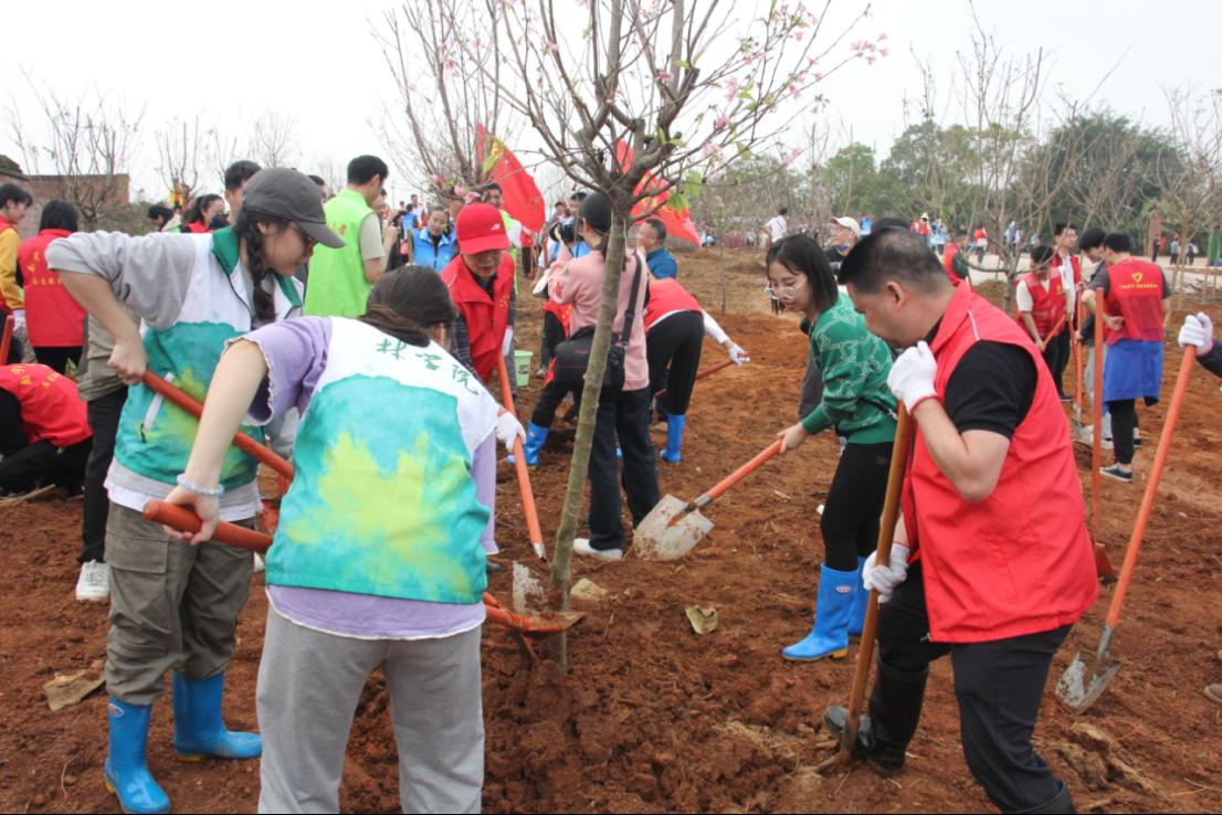 植树现场,大家热情高涨,齐心协力,按照分组有条不紊地开展植树工作,扶苗入坑、挥铲填土、提桶浇水……每道植树工序都做得认真细致,现场呈现出一片热火朝天的劳动景象,一株株新种下的樱花迎风挺立、错落有致。