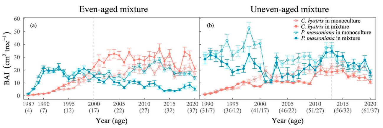 建立结构复杂且具有高生物多样性的混交林已成为提高人工林生产力和维护其长期稳定性的重要途径。然而,目前尚不清楚混交效应在林分随时间发育以及气候条件变化过程中呈现何种动态变化。此外,针对相同树种组合和相似立地条件下,同龄(Even-aged)与异龄(Uneven-aged)混交策略在影响树木生长方面的差异仍缺乏系统研究。