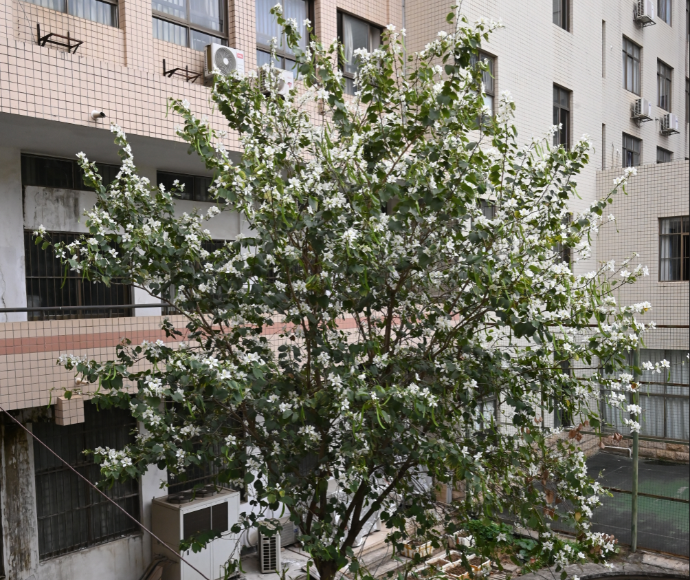 太阳成集团tyc33455cc第四教学楼院子里盛开的白花宫粉羊蹄甲