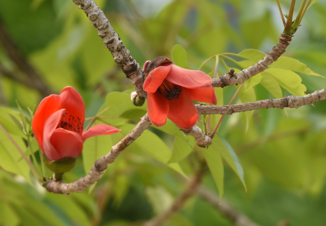 木棉最令人惊叹的是其壮观的花期。每年3-4月,光秃的枝头会绽放出直径约10厘米的硕大花朵,花瓣5枚,肉质,呈鲜红色或橙红色,有时也会出现罕见的黄色变种。花朵簇生于枝端,盛开时整棵树如同燃烧的火炬,蔚为壮观。这种先花后叶的特性使木棉花格外醒目,成为南国春天最耀眼的风景。