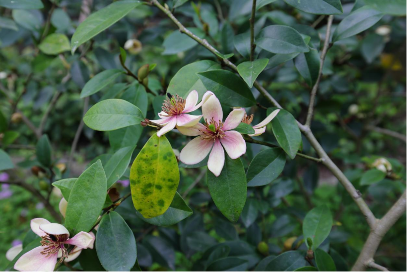 含笑花植株较为矮小,一般在2-3米。叶片碧绿有光泽,呈革质,长椭圆形,边缘平整。它的花朵小巧玲珑,直径约2-3厘米,花瓣淡黄色,边缘略带紫晕,如同精心绘制的艺术品。其花朵开放时并不完全展开,微微半开,犹如一位羞涩温婉的少女,含笑之名便由此而来。轻轻凑近,便能闻到一股清幽的香蕉般的香气,馥郁芬芳,萦绕不散。